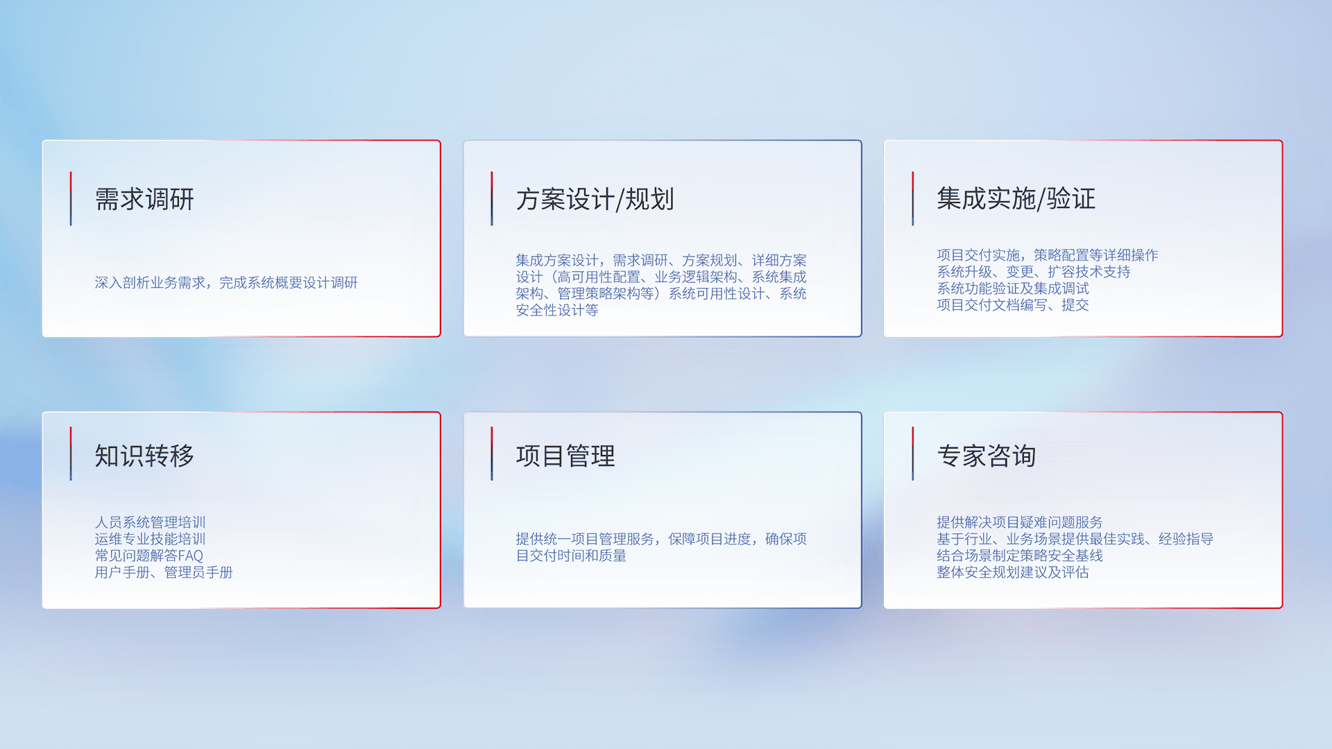 针对客户行业特性,,,,将宏观的安全战略和需求,,通过专业的交付服务,,实现项目落地,,,,为客户提供标准规范的集成交付服务。。。。