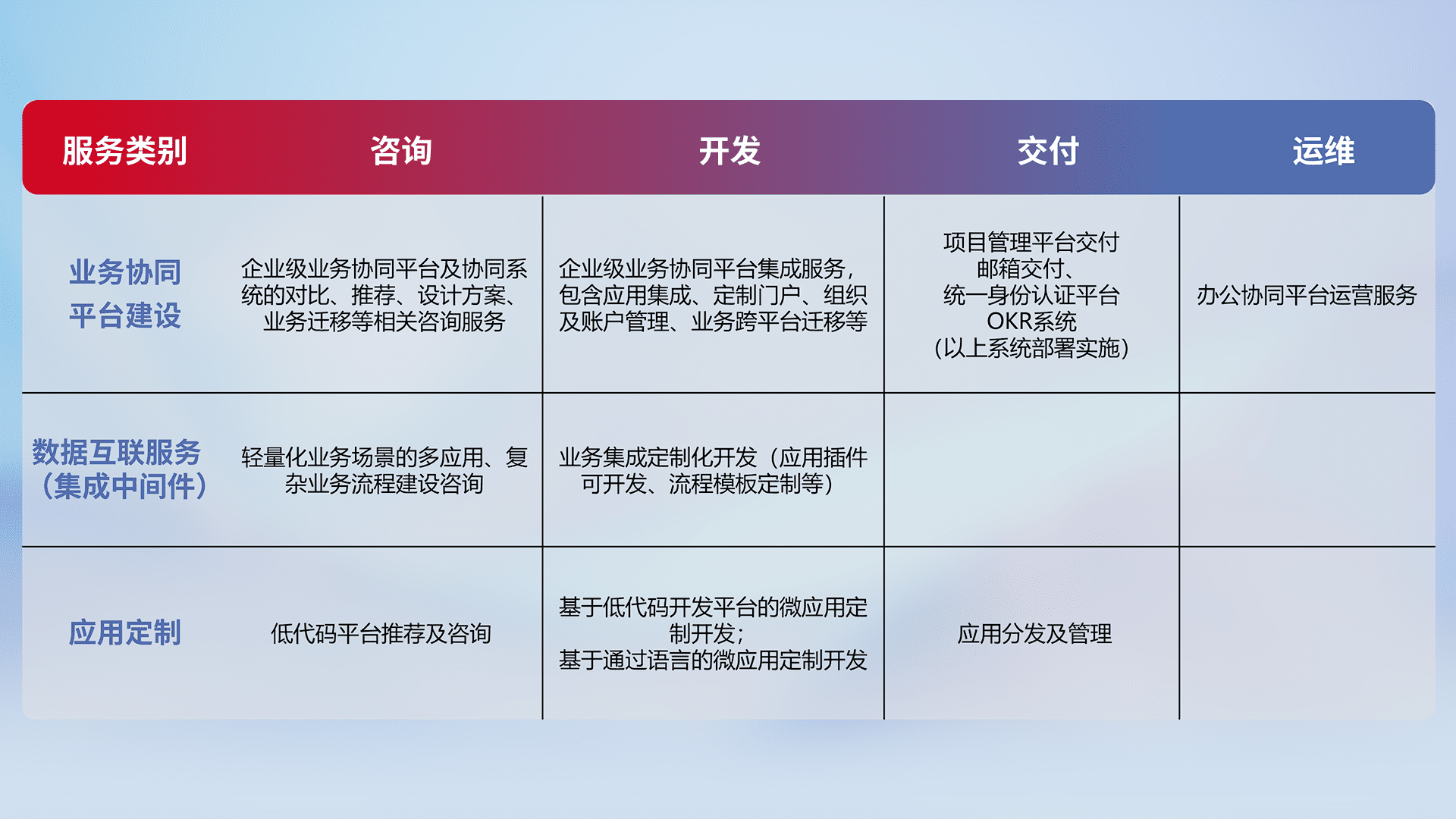 针对钉钉、、企微、、IDaas等平台级产品提供产品的规划、、、方案、、、、交付、、、定制化开发等服务,,,,实现如统一协同办公、、、智能客户服务、、、、混合会议管理、、、智能数据查询、、等业务场景,,,,实现数字化转型。。。